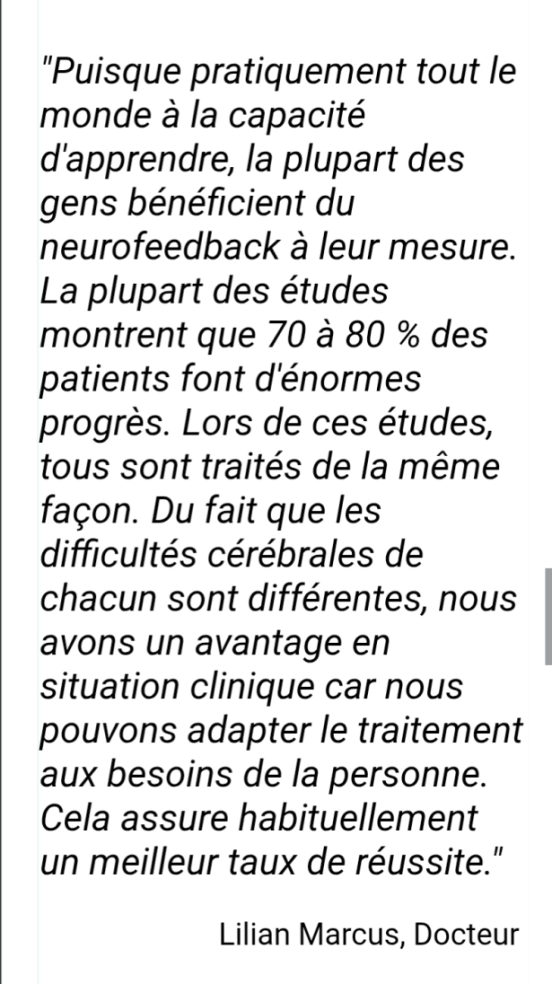 Je suis ravie des bienfaits du neurofeedback dynamic pour mon fils de 8 ans qui, après seulement quelques séances, se concentre davantage. Nous constatons effectivement de belles évolutions sur sa concentration et des progrès scolaires chaque semaine.