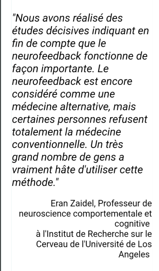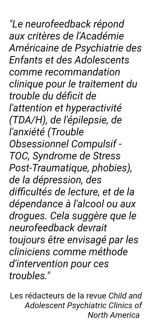 Je suis ravie des bienfaits du neurofeedback dynamic pour mon fils de 8 ans qui, après seulement quelques séances, se concentre davantage. Nous constatons effectivement de belles évolutions sur sa concentration et des progrès scolaires chaque semaine.