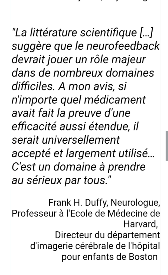 Je suis ravie des bienfaits du neurofeedback dynamic pour mon fils de 8 ans qui, après seulement quelques séances, se concentre davantage. Nous constatons effectivement de belles évolutions sur sa concentration et des progrès scolaires chaque semaine.